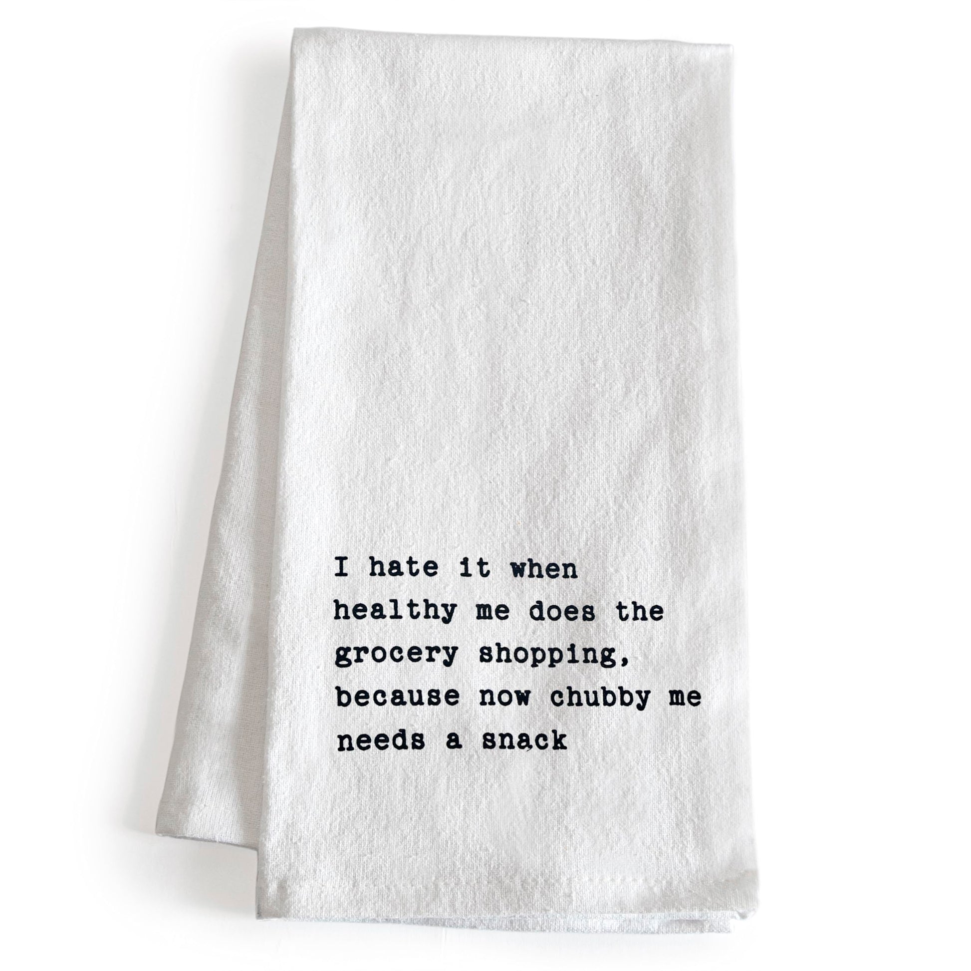 Towel-ly Hilarious - Bring joy to your kitchen with our I Hate It When Healthy Me Does The Grocery Shopping, Becasue Now Chubby Me Needs A Snack funny kitchen towel and get a quick laugh; Novelty tea towels that brighten your happy place