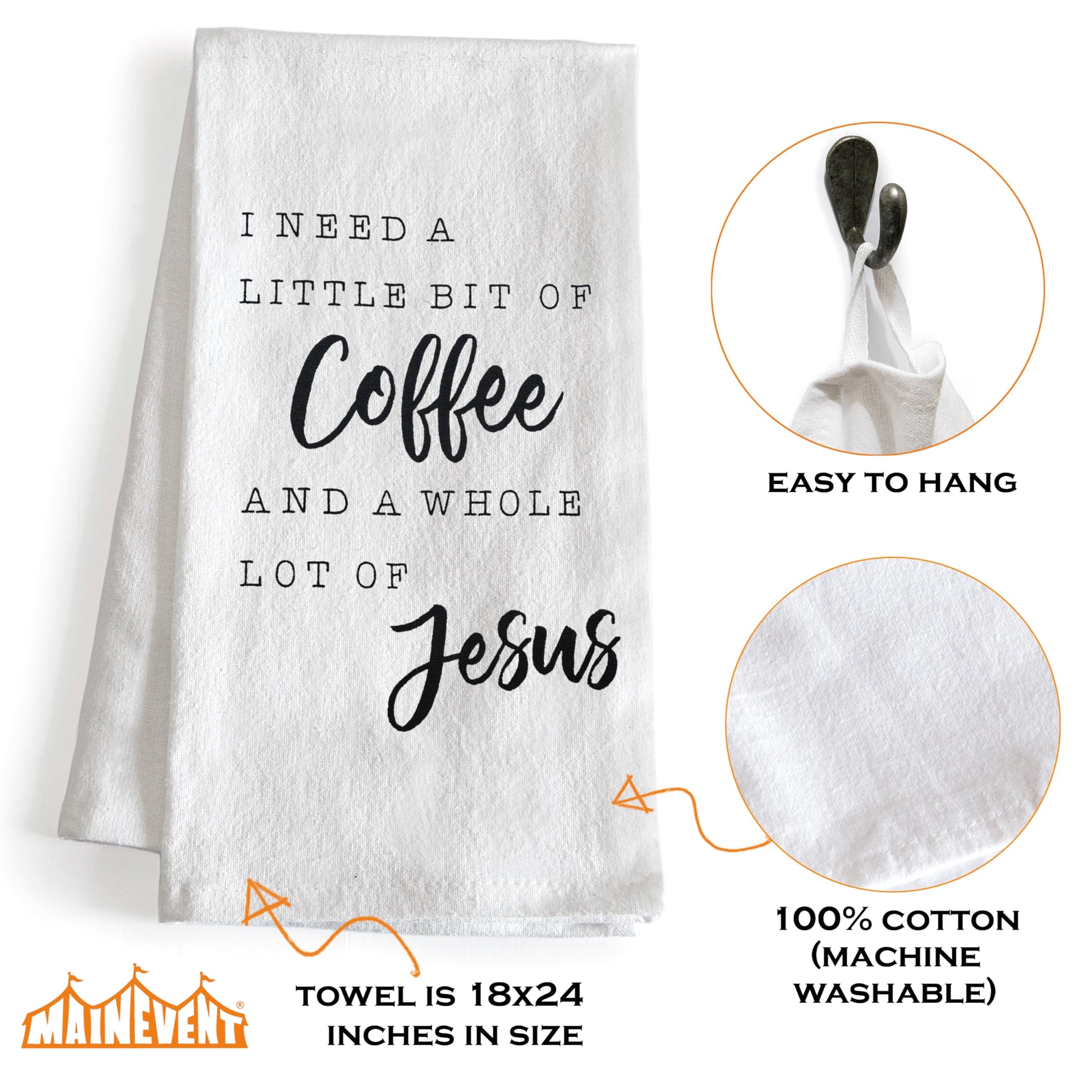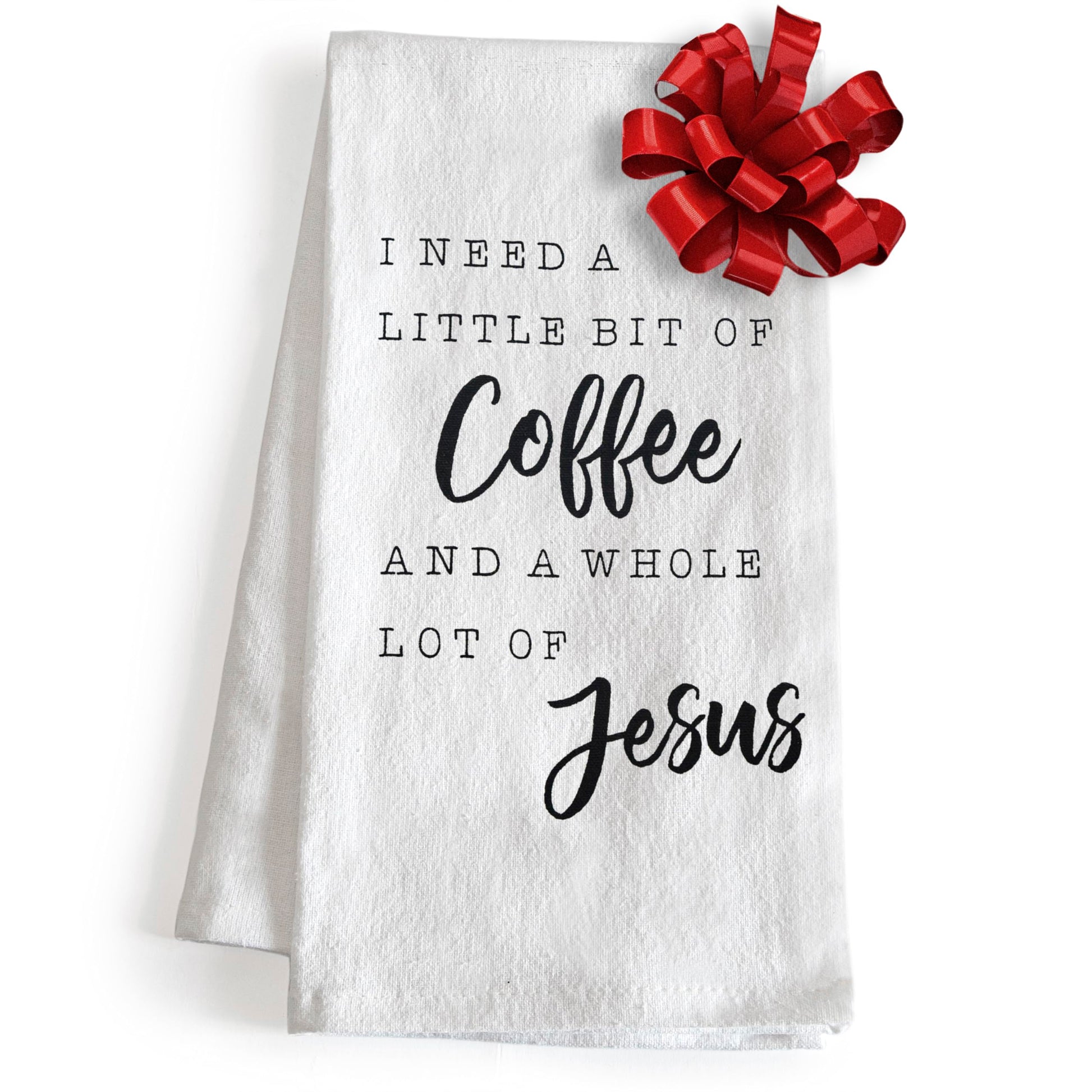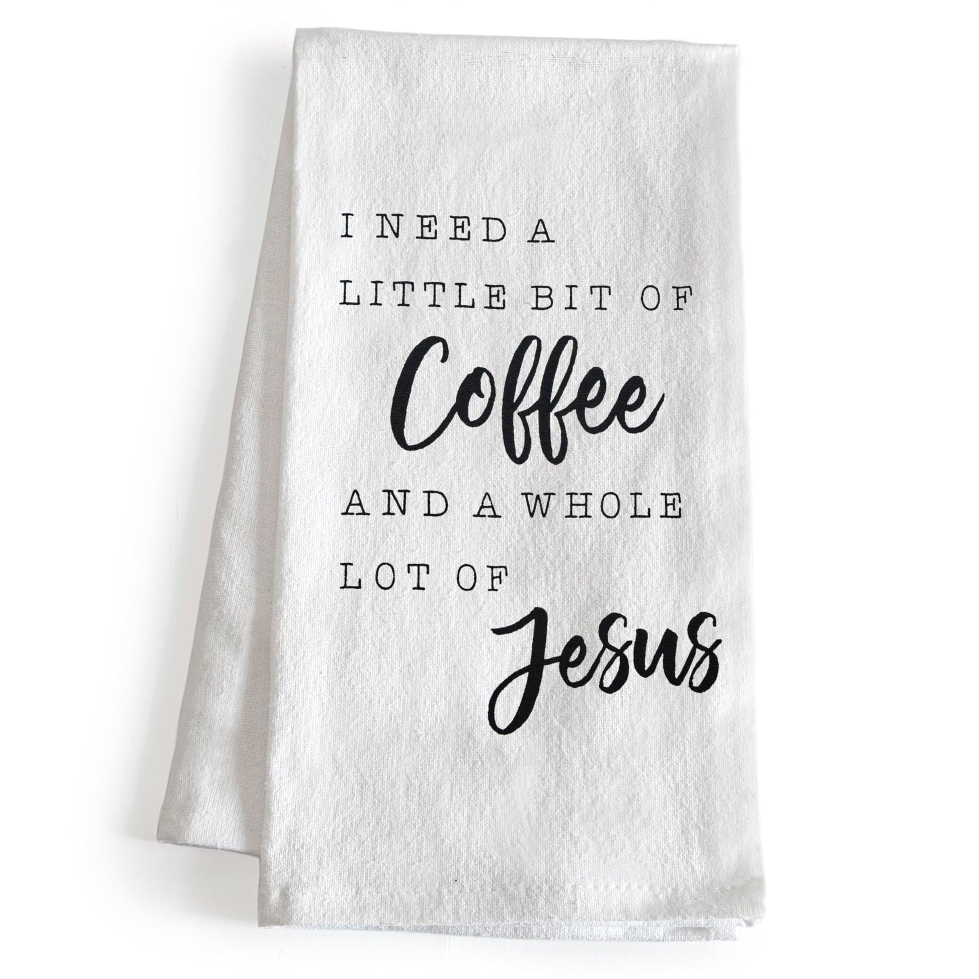 Towel-ly Hilarious - Bring joy to your kitchen with our I Need A Little Bit Of Coffee And A Whole Lot Of Jesus funny kitchen towel and get a quick laugh from guests; Novelty tea towels that brighten your happy place