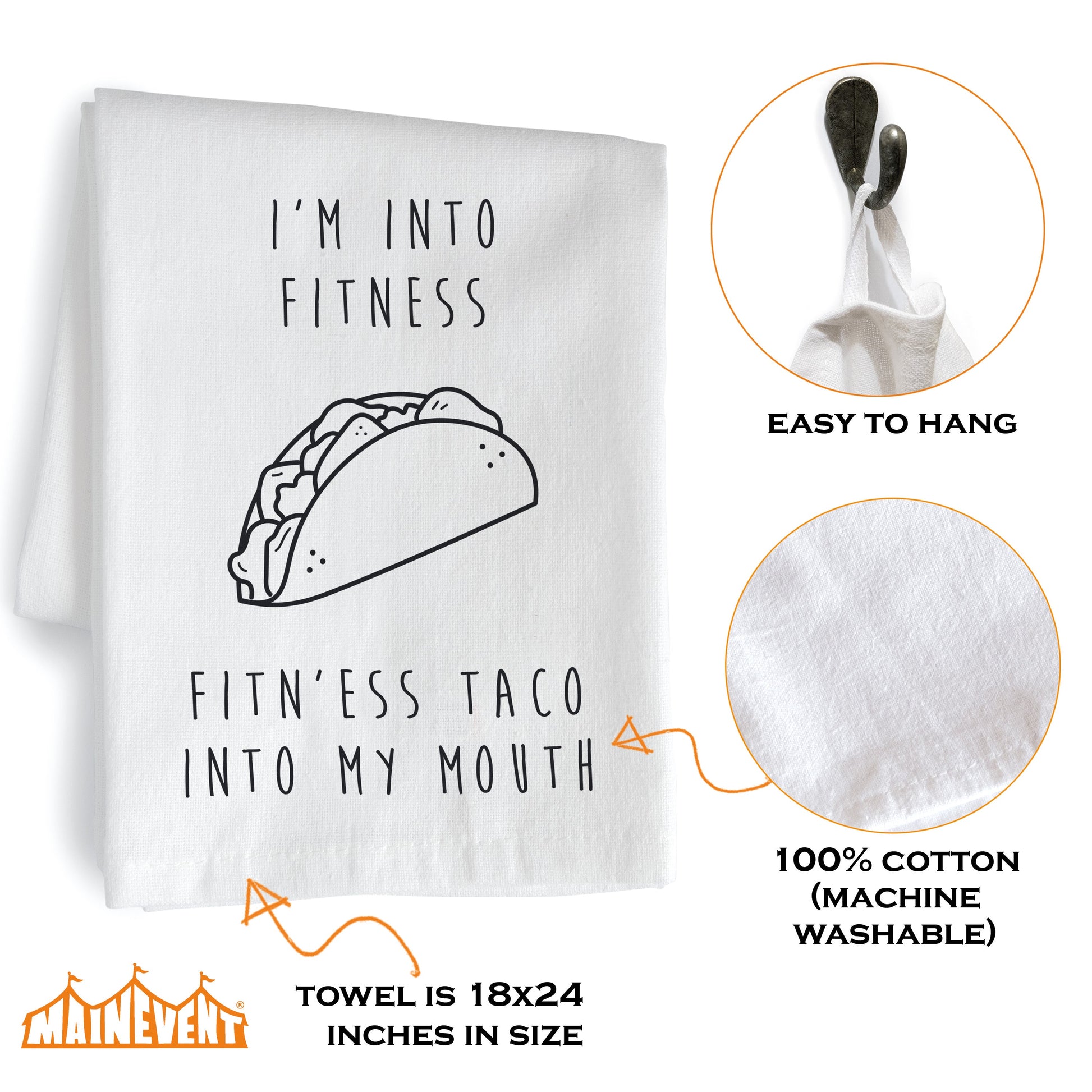 Bring joy to your kitchen with our I'm into Fitness. Fitn'ess Taco Into My Mouth funny hand towel and get a quick laugh from guests; Novelty tea towels brighten your happy place as you cook and celebrate