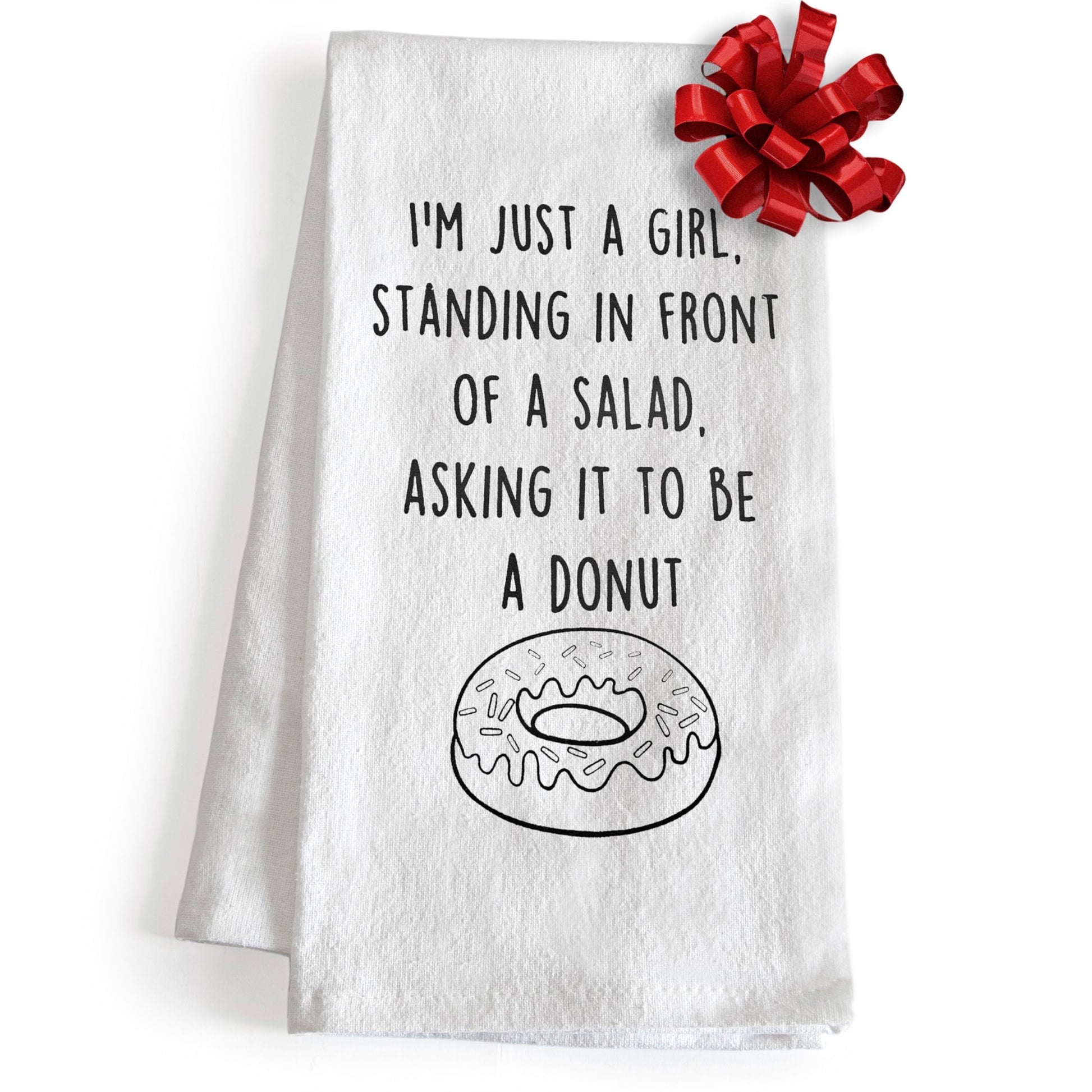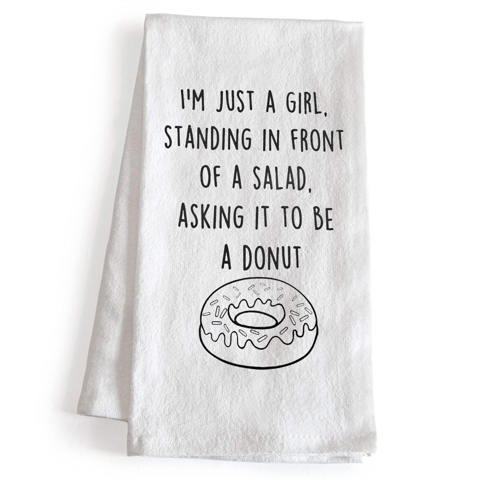 Towel-ly Hilarious - Bring joy to your kitchen with our I'm Just A Girl Standing In Front Of A Salad Asking It to be a Donut funny kitchen towel and get a quick laugh; Novelty tea towels that brighten your happy place