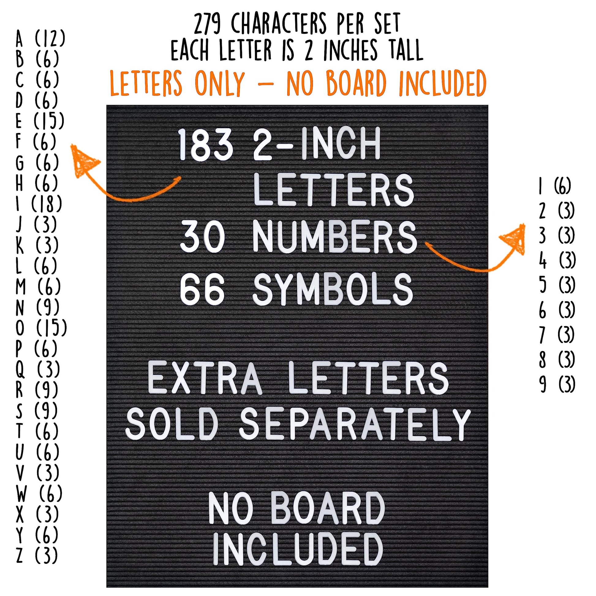 - Convenient - Pre-cut plastic letters for letter board save time and effort during setup; Letter board symbols for a hassle-free customization; Note that you will get 2 inch white letter board letters only, BOARD IS NOT INCLUDED