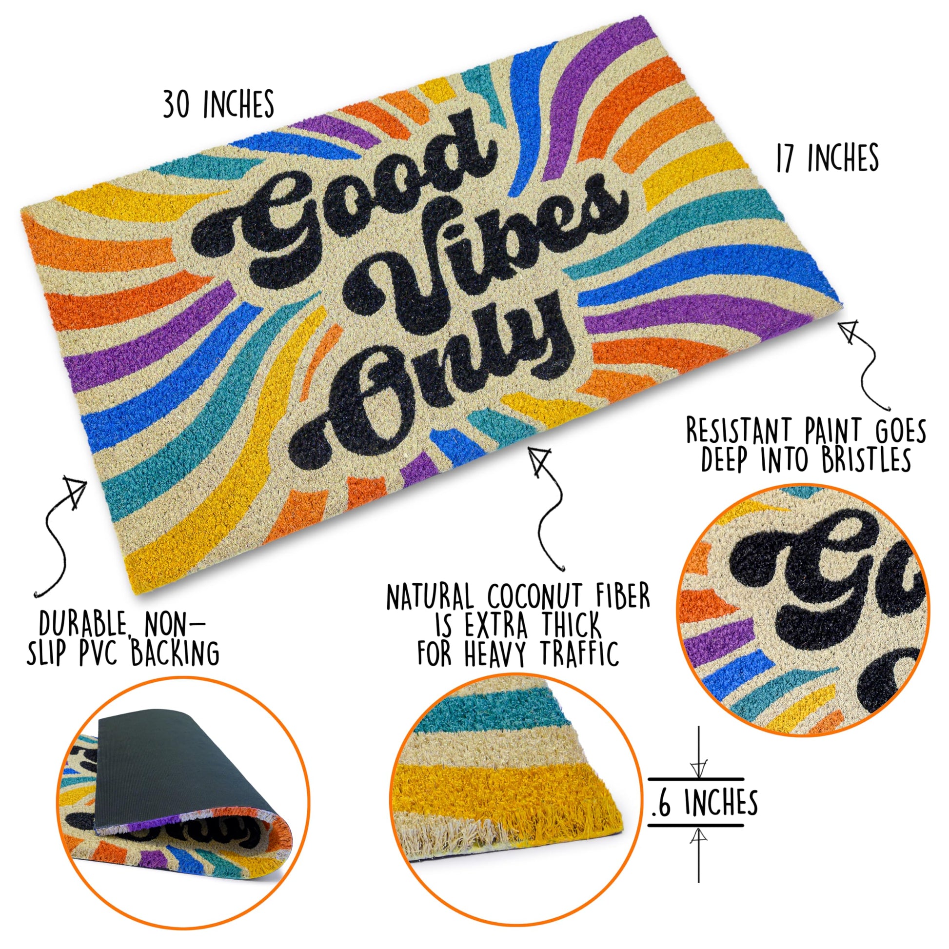 Good Vibes Only Coir Door Mat 30x17 Inch, Retro-themed Doormats Rugs Outdoor