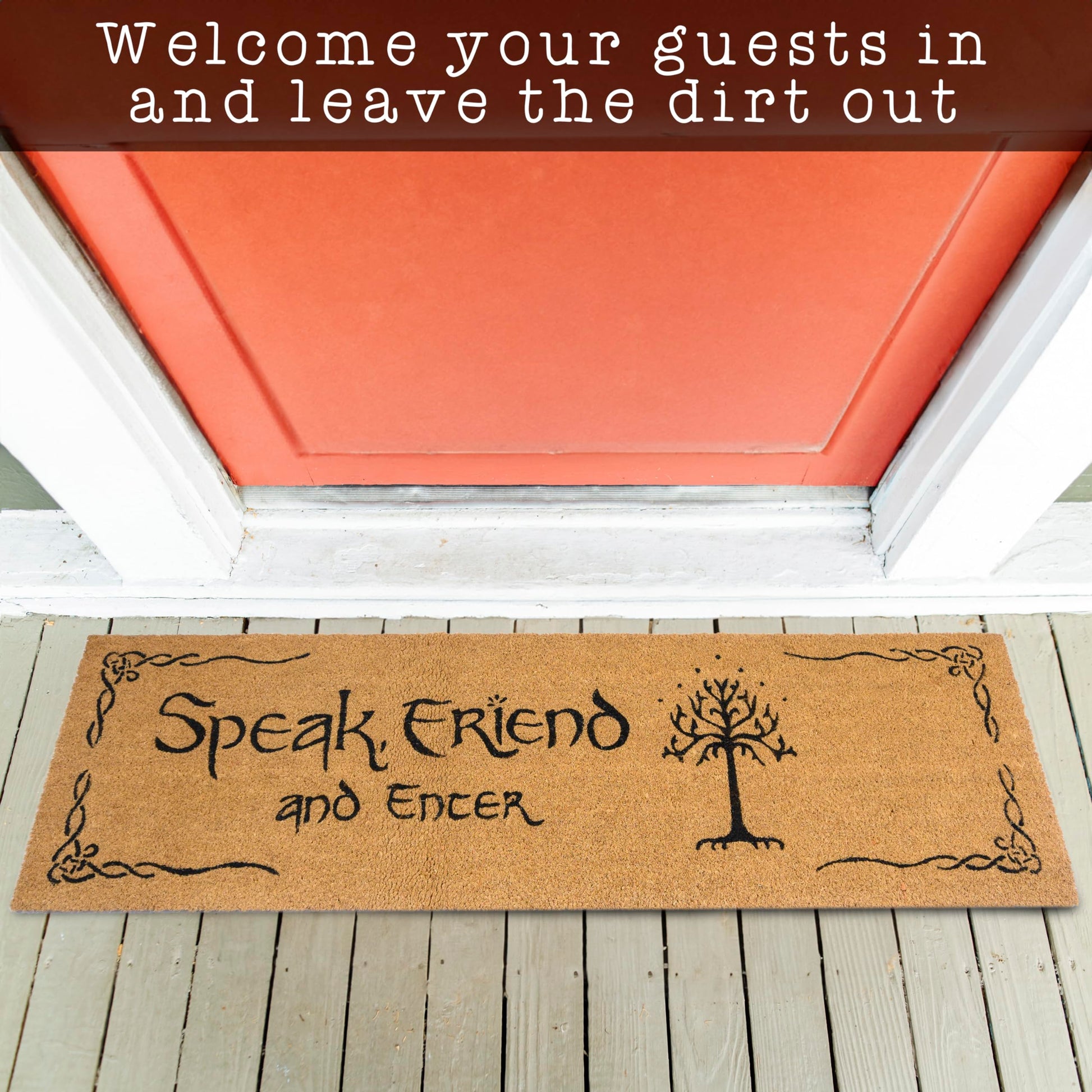 First step, style statement - Our Speak Friend and Enter welcome mat funny is a geeky way to greet your guests; Lord of the rings merchandise coir door mat for the home