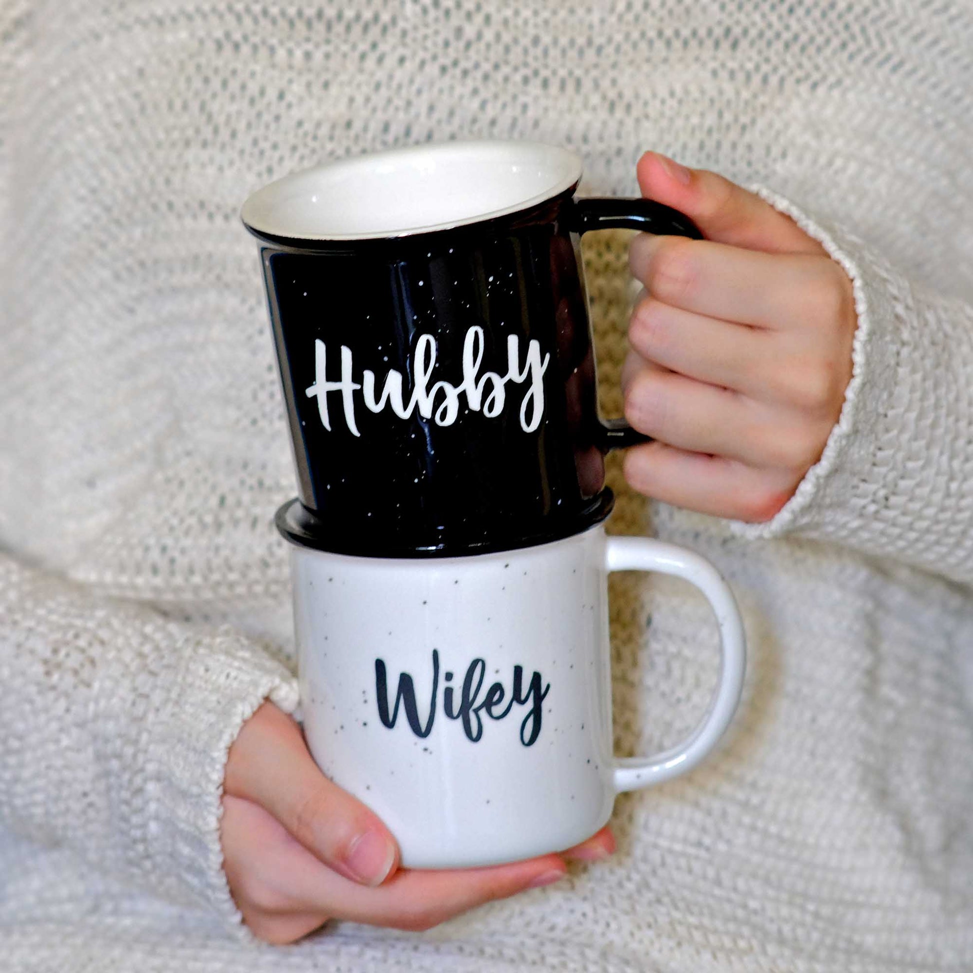 FADE-RESISTANT - Our husband and wife coffee mug set has a bright color speckled look and black halo edge; Couple wifey hubby cup with imprinted text that do not fade.