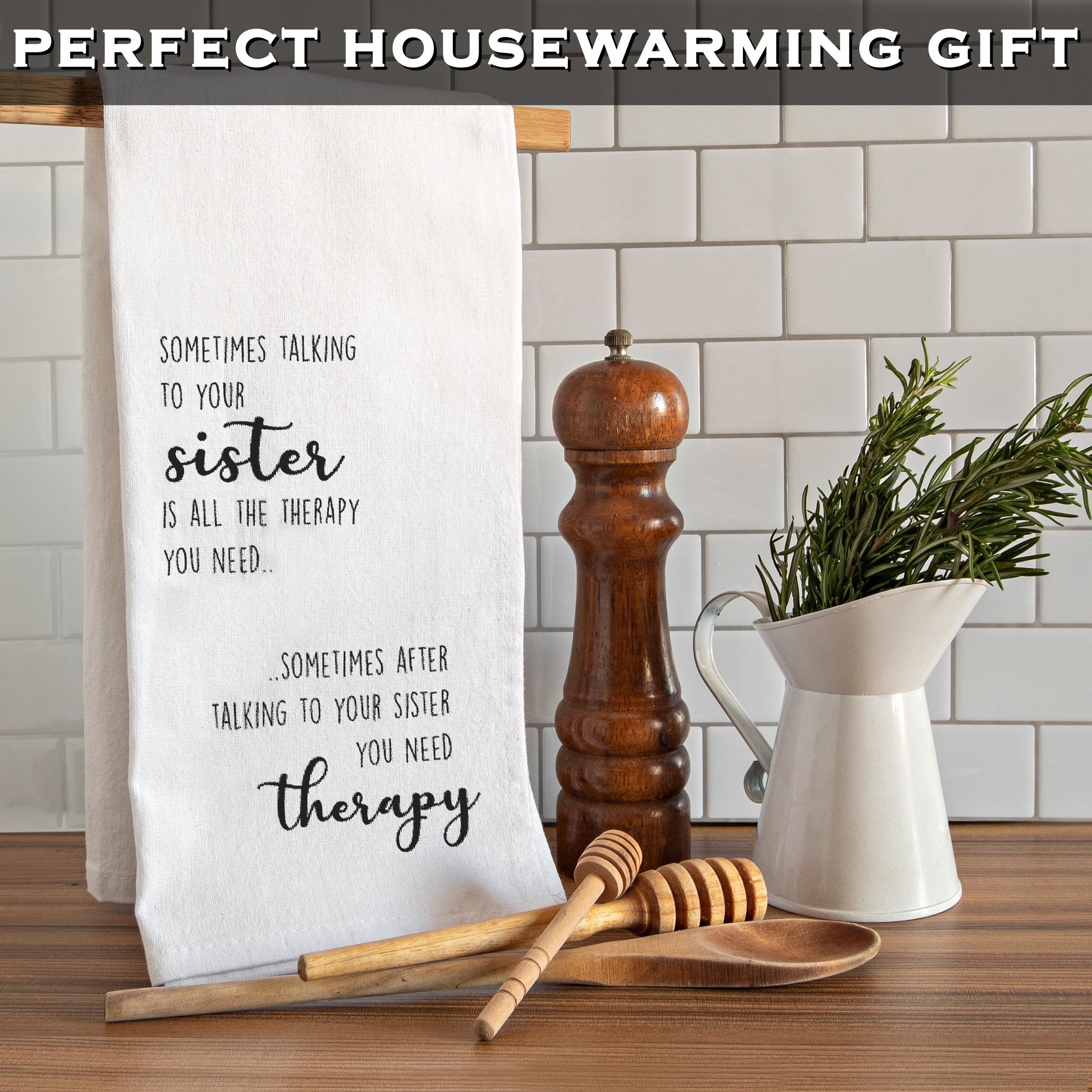 Bring joy to your kitchen with our Sometimes Talking to Your Sister Is All The Therapy You Need towel and get a quick laugh from guests; Novelty tea towels brighten your happy place as you cook and celebrate